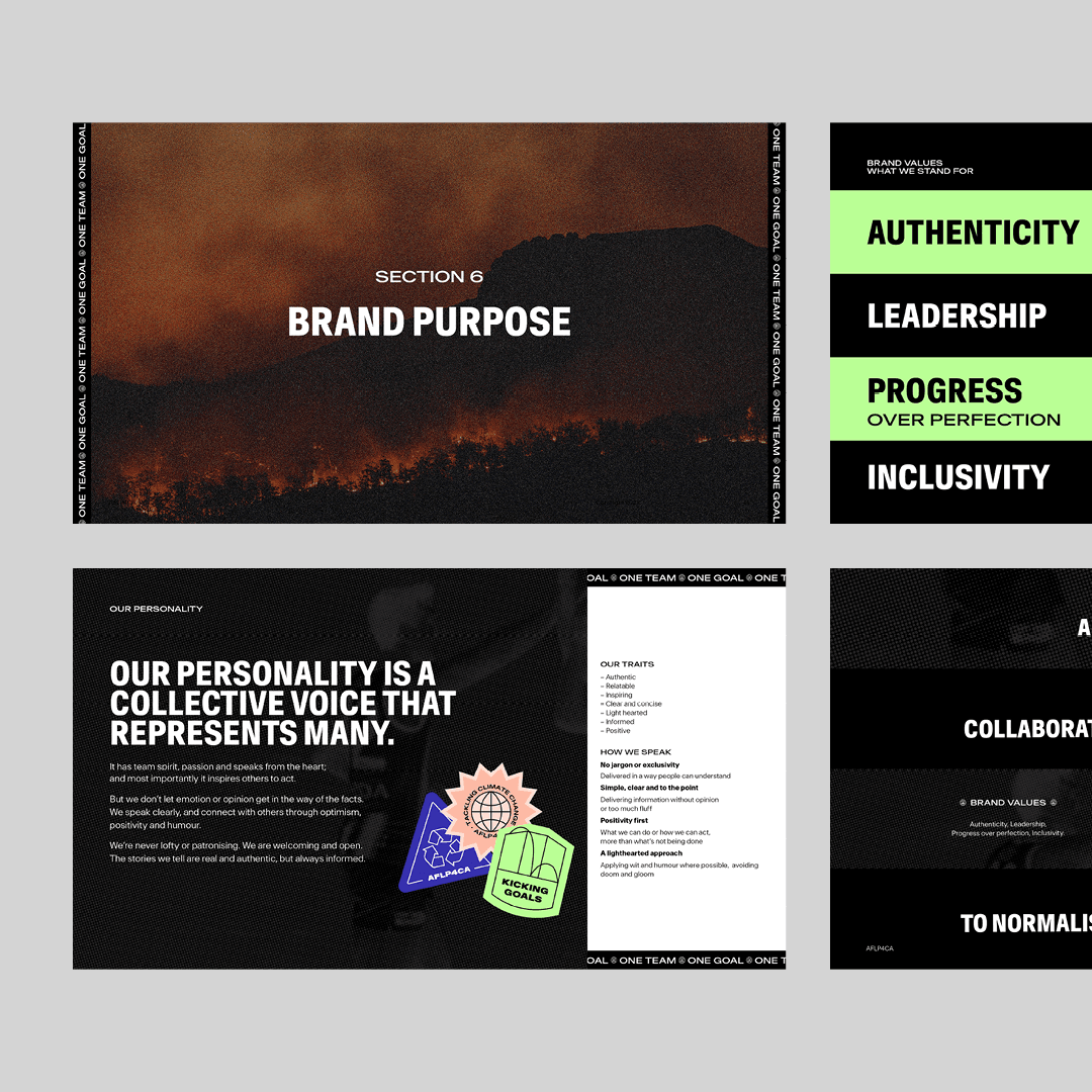 By keeping core sustainability leadership principles at the foundation of the strategy, we could ensure that the brand’s focus on climate action could be brought through in everything that they do. We built on the strategic foundations with the brand’s visual identity that combined ideas of community, teams and AFL supporter culture to launch a movement that could engage with AFL fans, the AFL as an industry body, players, ex-players and climate activists alike. We created a dynamic and flexible identity that could adapt in time and to suit it’s audience. An identity that is true to the group's vision and grass roots ethos, that their community can feel part of and wear with pride. We created a team brand, for a team of people passionate about climate action.