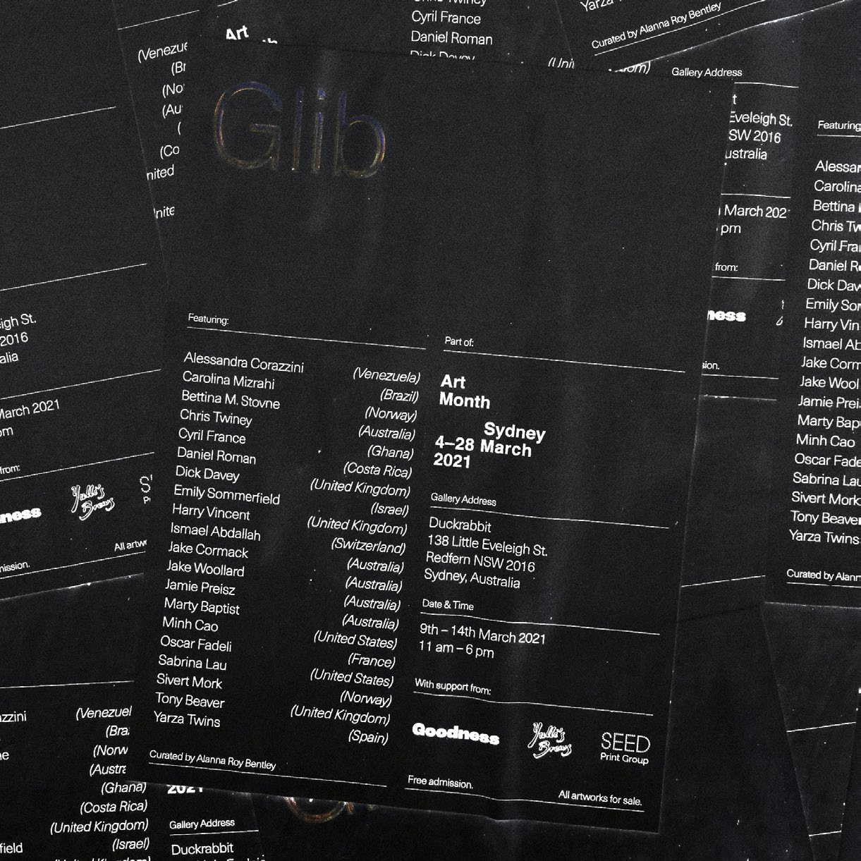 A group art show which invited 20 different artists from around the world to respond to the word “Glib”.