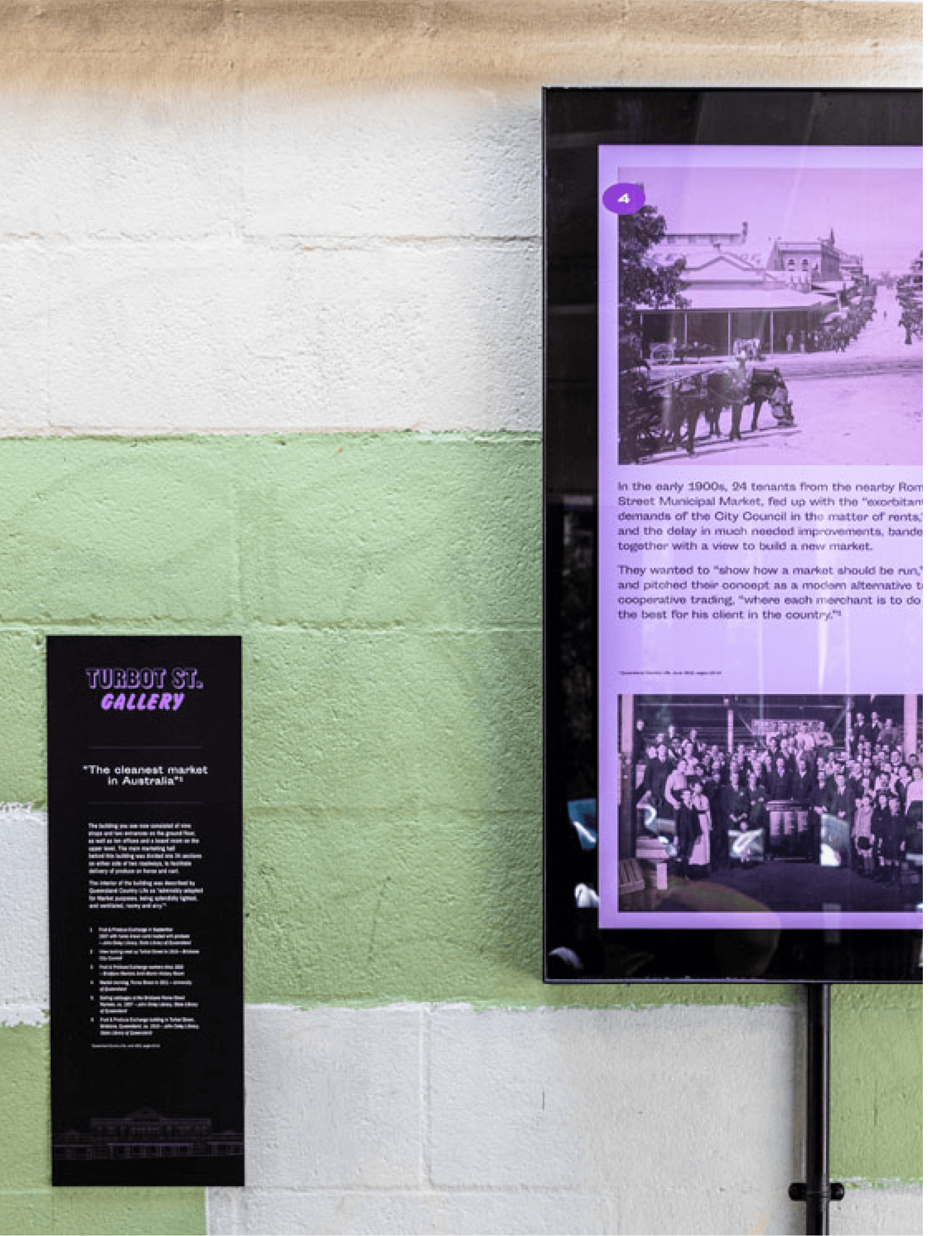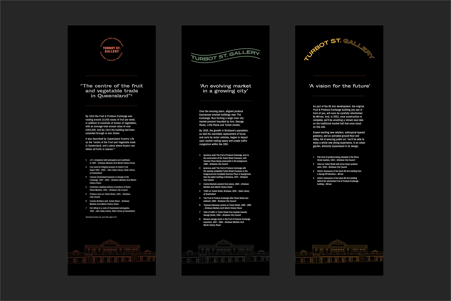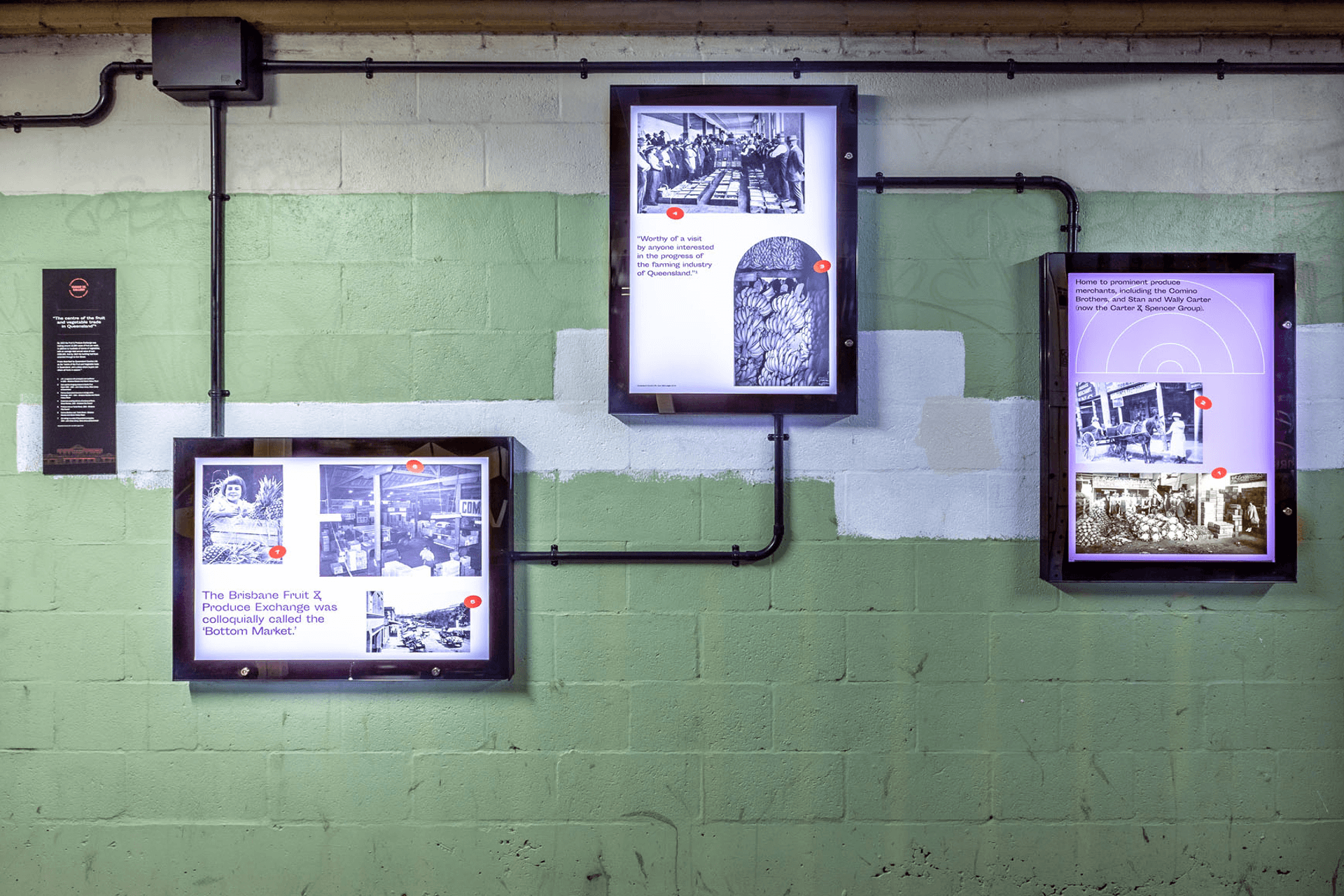 We needed a solution that would be influenced by what was, whilst giving a flavour of what was coming next. Inspired by the world of fruit and vegetable branding of yester-century, we created an informative homage to 80 Ann Streets’ prior history as the site of the Brisbane Fruit and Produce Exchange. With access to a wealth of historical imagery and rich stories from the area’s past, we were able to combine our original content with some truly iconic images thanks to Queensland State Library. A modular lightbox and signage system helped create an easy to navigate flow of information and by keeping the imagery and visuals bold and impactful, we were able to brighten up the walkway at all times of the day or night. With our on take on this historical context, we reimagined the visual language of the old market to create something unexpected, that helped educate passers by of the building's vibrant past while it undergoes a drastic transformation.